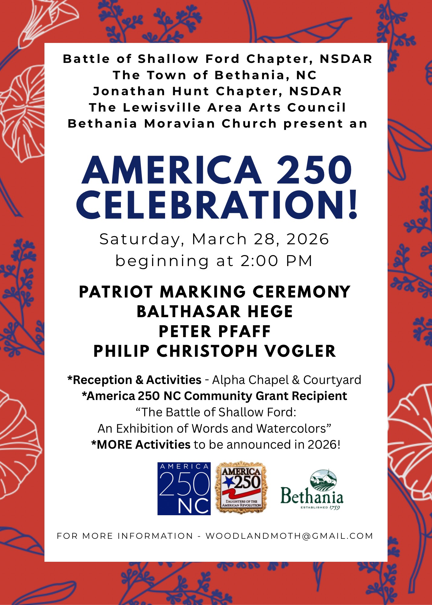 The Battle of Shallow Ford: The following dates are confirmed with more information, schedules and advertising Beginning March 2025. ![]() Battle of Shallow Ford Chapter, NCSDAR - DAR America 250 Committee pin ©NSDAR Current and Upcoming Dates Bethania, NC, Alpha Chapel March 28, 2026 Immediately following a Triple Patriot Marking for: Balthasar Hege, Peter Pfaff, Philip Christoph Vogler beginning sharply at 2 PM at Bethania Moravian God's Acre. presented by The Town of Bethania, NC, Lewisville Area Arts Council, Battle of Shallow Ford, NCSDAR and the Jonathan Hunt Chapter, NCSDAR.